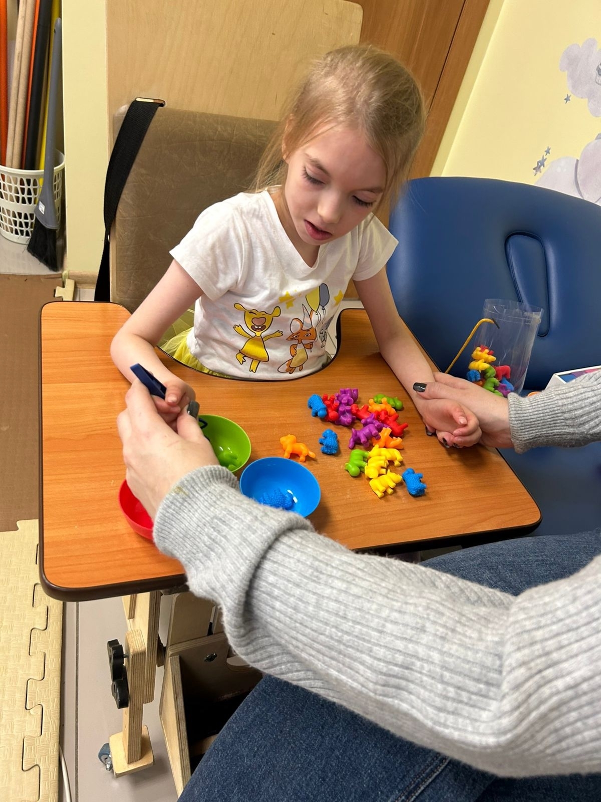 Но на этом день не закончился — мы играли в увлекательную игру на развитие восприятия цвета. Ребята сортировали животных по цветам, раскладывая их в тарелочки соответствующего цвета.